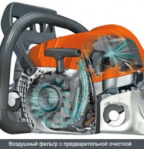 Всаcываемый воздух с помощью маховика перемещается по круговой траектории. За счет центробежной силы более крупные и тяжелые частицы грязи удаляются наружу. В результате на воздушный фильтр попадает воздух, не содержащий частиц. Благодаря этому срок службы воздушного фильтра продлевается и пилу можно использовать в 2 раза дольше без чистки фильтра.
