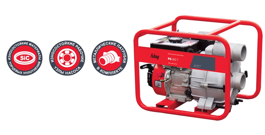 Тип жидкости - сильно загрязнённая вода, тип двигателя - 4-х тактный, двигатель - Fubag OHV, мощность - 5,1 кВт / 7,0 л.с., диаметр впуска/выпуска - 80/80 мм, высота напора - 26 м, высота всасывания - 8 м, максимальная производительность - 1300 л/мин, ёмкость топливного бака - 3,6 литра, вес - 39 кг, габариты (Д*Ш*В) - 562*455*472 мм